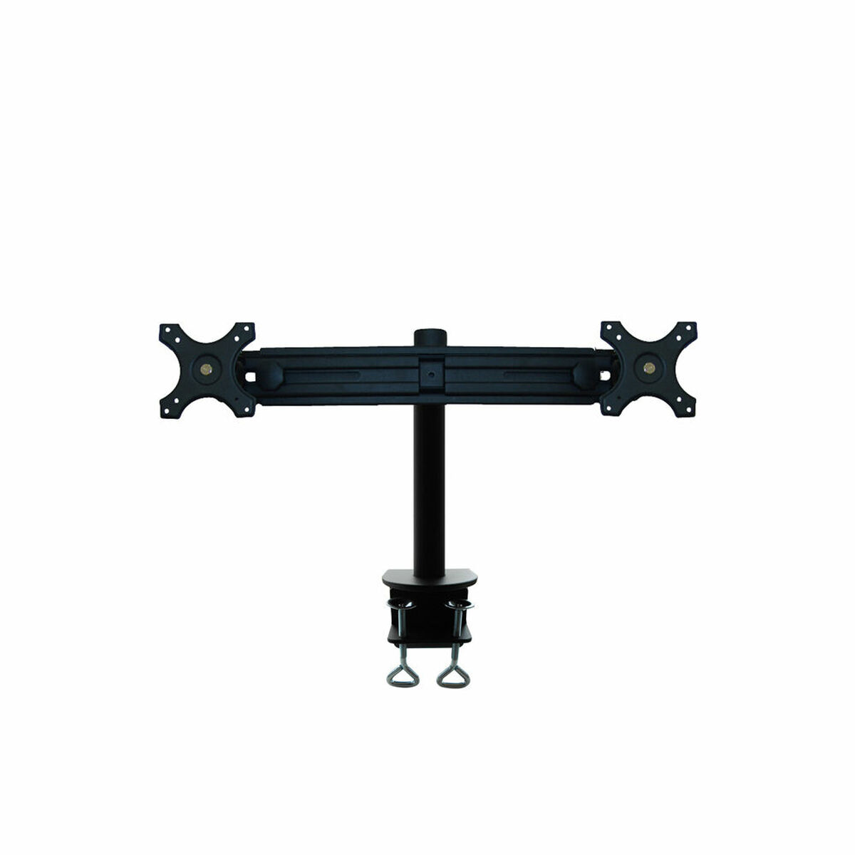 The Neomounts FPMA-D700D desktop mount is an ergonomic system specifically designed to hold two LCD, LED, or TFT screens simultaneously, with sizes ranging from 19 to 30 inches (48.3 to 76.2 cm). This black mount is compatible with the most common VESA mounting standards, including 75 x 75 mm and 100 x 100 mm patterns, as well as smaller sizes of 7.5 x 7.5 cm and 10 x 10 cm, ensuring great versatility for most monitors on the market. Its structure allows a height adjustment of up to 42 cm, which can be easily modified to achieve an optimal ergonomic position, minimizing neck and back discomfort during long work sessions. Additionally, it includes mechanisms to swivel, tilt, and rotate the screens within a tilt range of 0 to 180 degrees, facilitating personalized orientation and enhancing the viewing experience according to user needs. Installation is simple thanks to its desk clamp system, which firmly secures the mount to the desk without the need for drilling or complicated tools. Each arm supports a maximum load of 8 kg, ensuring stability and safety even with heavy monitors. This model is ideal for office environments, counters, and receptions where dual screens are required to improve productivity, provide personalized service, or manage multiple applications simultaneously. In summary, the Neomounts FPMA-D700D combines robustness, flexibility, and ergonomics in a practical and functional design aimed at optimizing space and user comfort.
